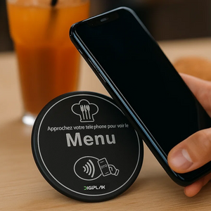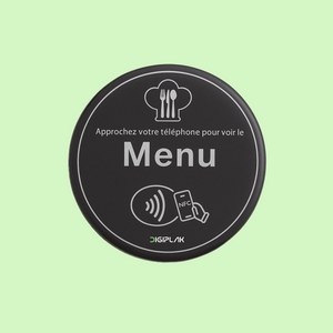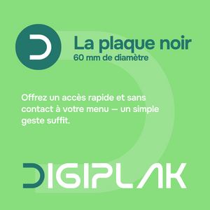 Discrète et raffinée, la plaque noire NFC est idéale pour partager vos informations en toute simplicité. Son diamètre de 60 mm lui confère un format compact qui s’adapte parfaitement à tous les espaces, que ce soit dans un magasin, un bureau ou un stand professionnel.