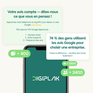 Chez DigiPlak, nous offrons des plaques NFC et cartes digitales modernes, pratiques et 100% fiables. Comparez par vous-même et voyez la différence !