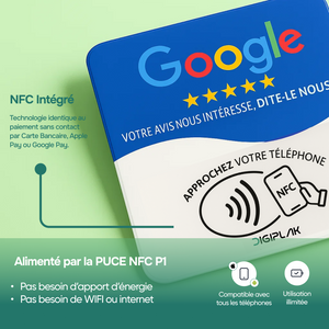 Rendez votre établissement plus visible en ligne grâce à la plaque Google NFC. En un simple geste, vos clients peuvent scanner ou approcher leur téléphone pour accéder directement à votre page Google et laisser un avis en quelques secondes.